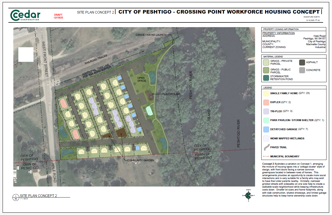 The City of Peshtigo is sharing the Draft Crossing Point Workforce Housing Concept Plan Report as part of an early planning and information-gathering process. City of Peshtigo_CrossingPoint_Concept Plan Report