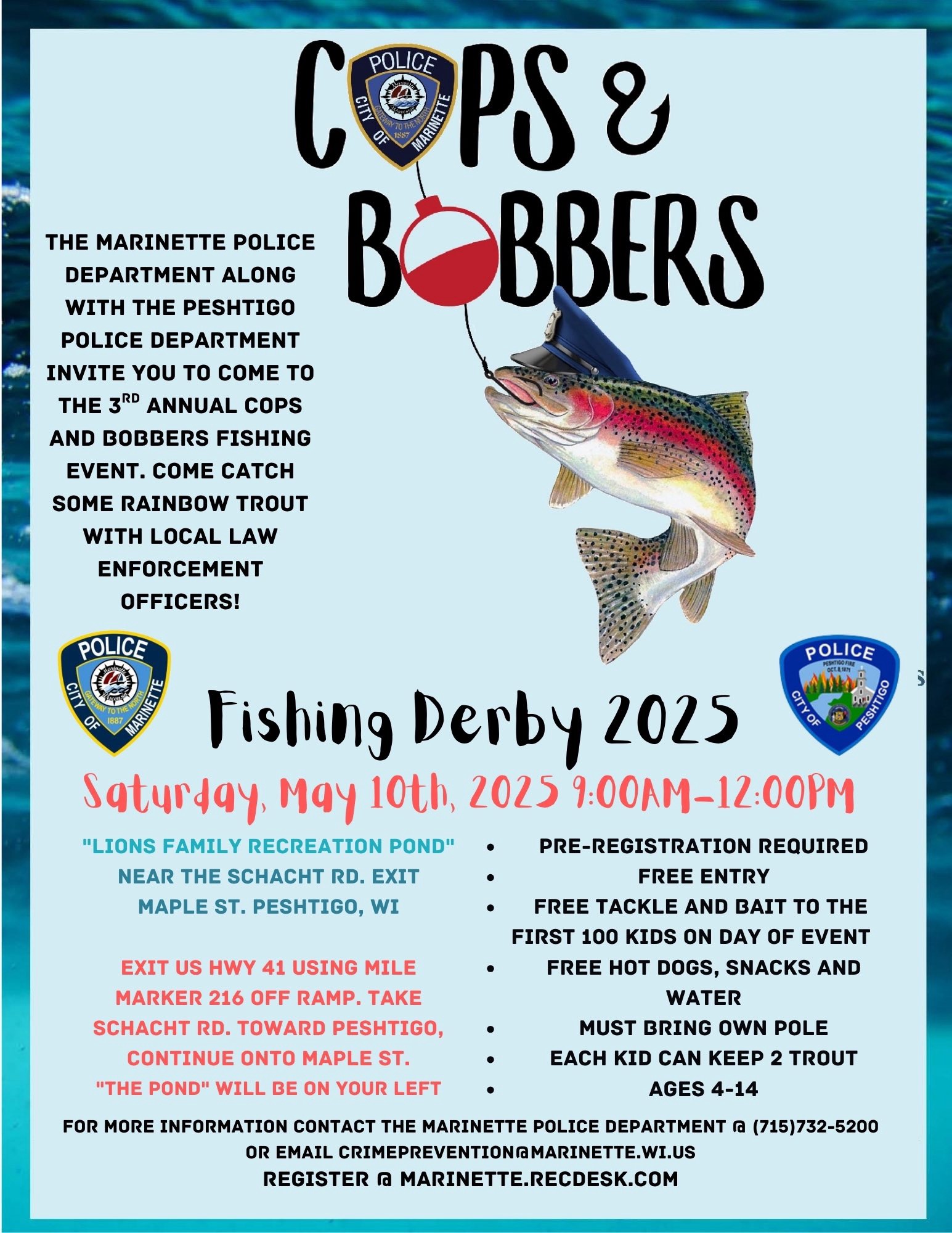 - Cops & Bobbers (Lion’s Pond, Peshtigo) – Our officers, along with the City of Marinette PD, fish with local youth and families while sharing water‑safety tips and outdoor ethics. It’s a relaxed way to build relationships and have fun together.